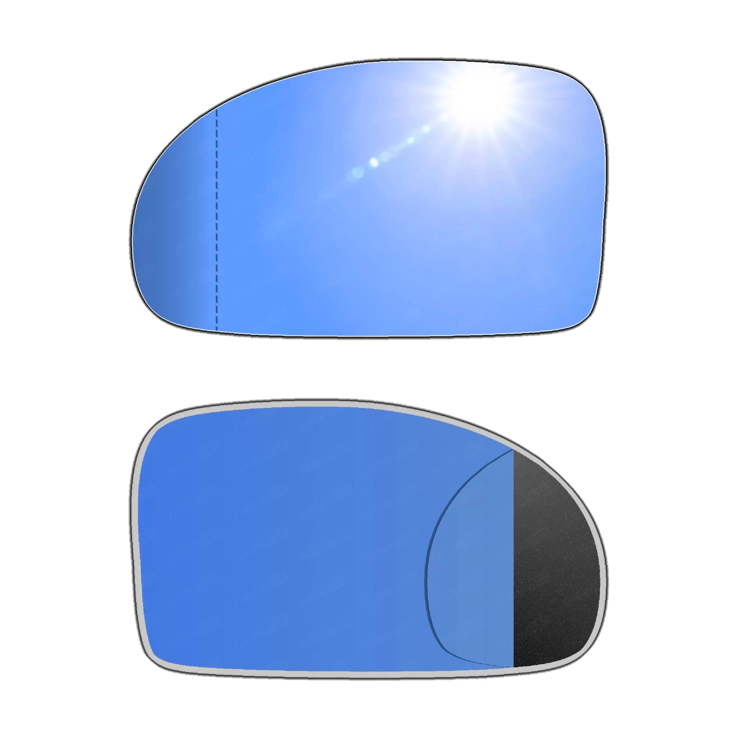 Niebieski (antyrefleksyjny)Powłoka w niebieskim odcieniu pomaga tłumić odbicia światła, zwłaszcza w nocy, co zapobiega oślepianiu kierowcy przez światła samochodów jadących z tyłu. Takie rozwiązanie działa podobnie jak lusterka FOTOCHROMATYCZNE i ELEKTROCHROMATYCZNE, ale w bardziej pasywny sposób i są od takich lusterek znacznie tańsze.W niektórych modelach, szczególnie w samochodach sportowych lub klasy wyższej, niebieska tonacja była stosowana, by nadać pojazdowi nowoczesny i prestiżowy wygląd.