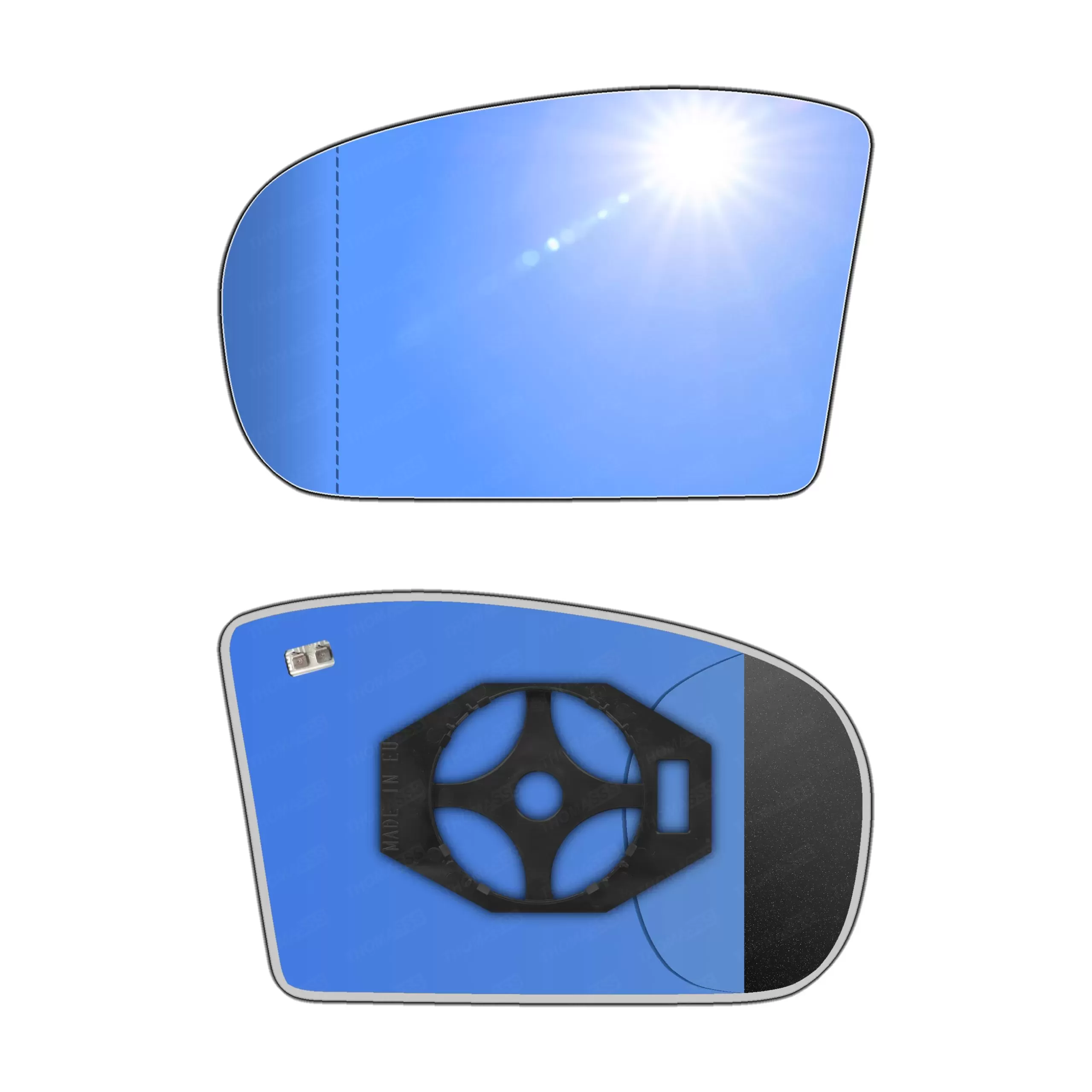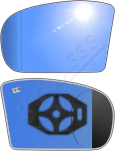Antyrefleksyjny lewy ogrzewany wkład asferyczny lusterka - z plastikiem montażowym typu E0 i niebieskim oddalającym szkłem z grzałką [#044] do zastosowaniaw Mercedes-Benz W203 [klasa C]