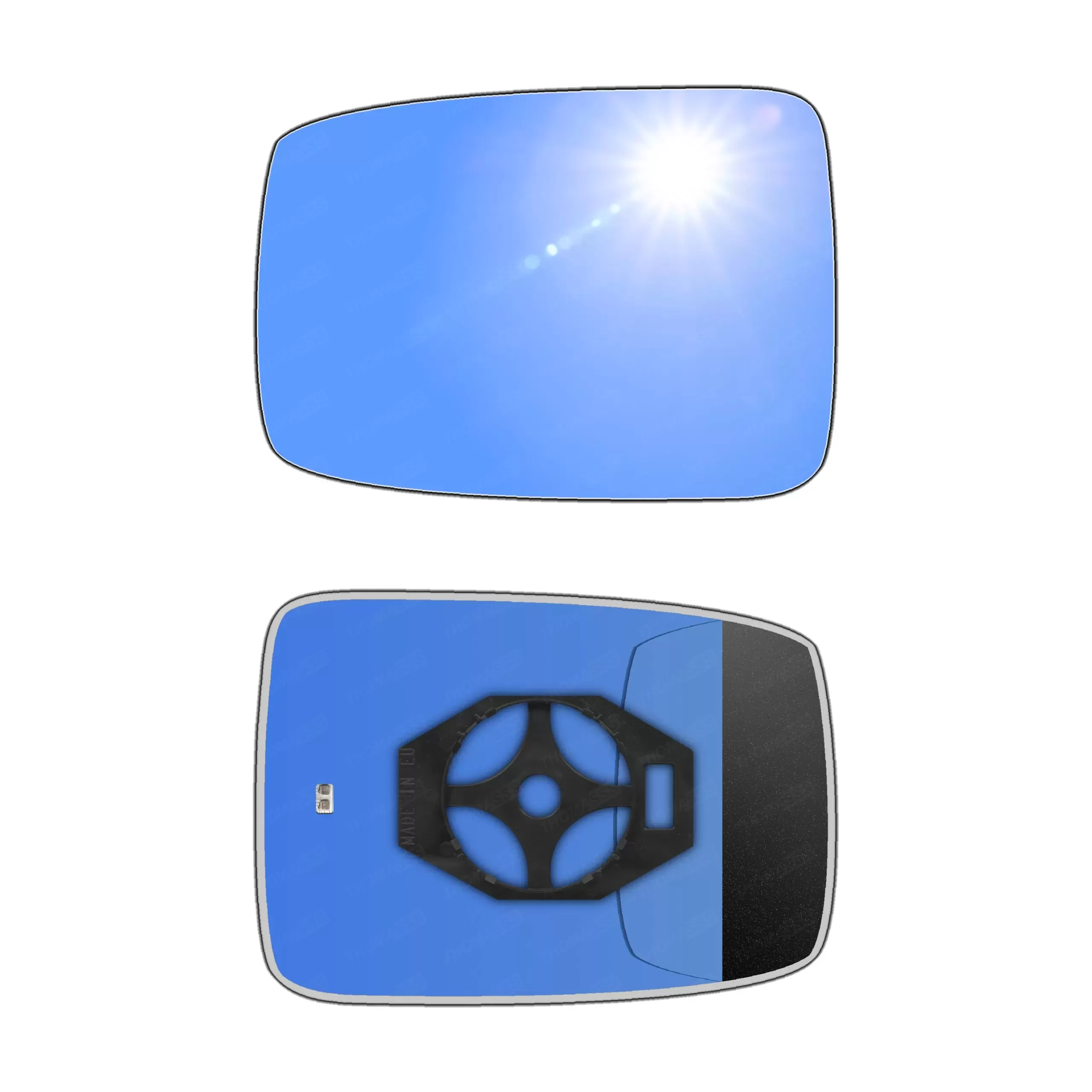 Niebieski (antyrefleksyjny)Powłoka w niebieskim odcieniu pomaga tłumić odbicia światła, zwłaszcza w nocy, co zapobiega oślepianiu kierowcy przez światła samochodów jadących z tyłu. Takie rozwiązanie działa podobnie jak lusterka FOTOCHROMATYCZNE i ELEKTROCHROMATYCZNE, ale w bardziej pasywny sposób i są od takich lusterek znacznie tańsze.W niektórych modelach, szczególnie w samochodach sportowych lub klasy wyższej, niebieska tonacja była stosowana, by nadać pojazdowi nowoczesny i prestiżowy wygląd.