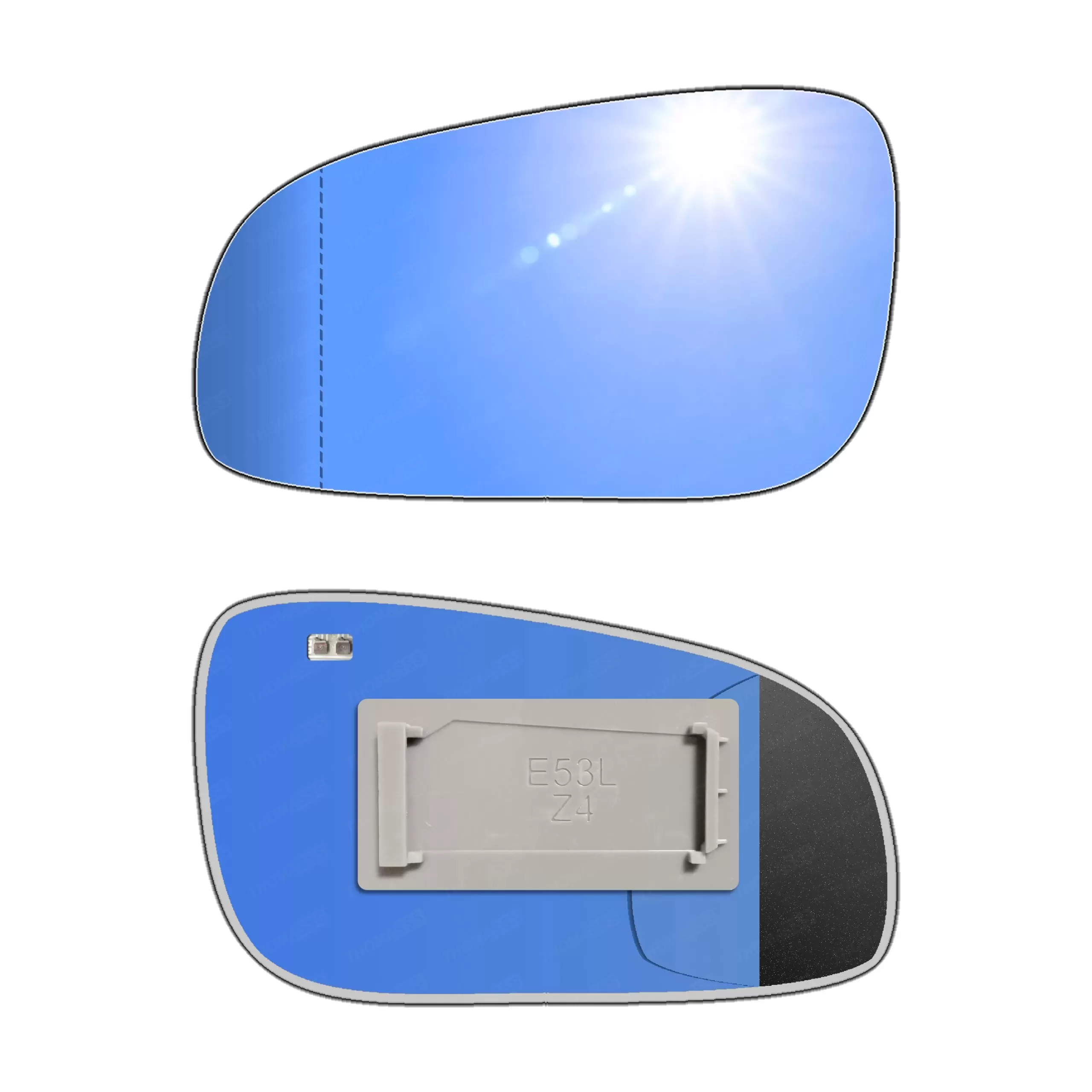 Antyrefleksyjny lewy ogrzewany wkład asferyczny lusterka - z plastikiem montażowym typu E53 i niebieskim oddalającym szkłem z grzałką [#037] do zastosowaniaw Volvo S80 I