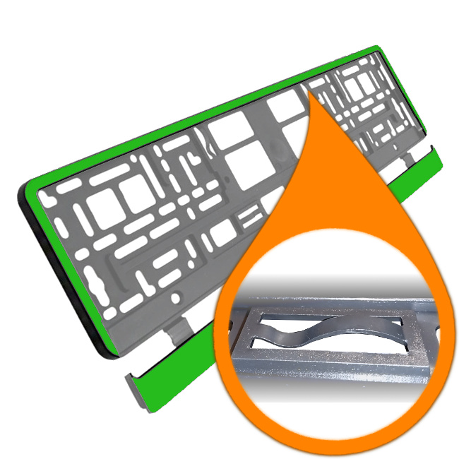 Polskiej produkcji najwyższej jakości ramka do montażu tablicy rejestracyjnej pojazdu posiadająca wszystkie wymagane atesty (numery atestów znajdują się na produkcie). Najwyższej jakości tworzywo jest bardzo elastyczne, niełamliwe podczas montażu, odporne na działanie warunków atmosferycznych.