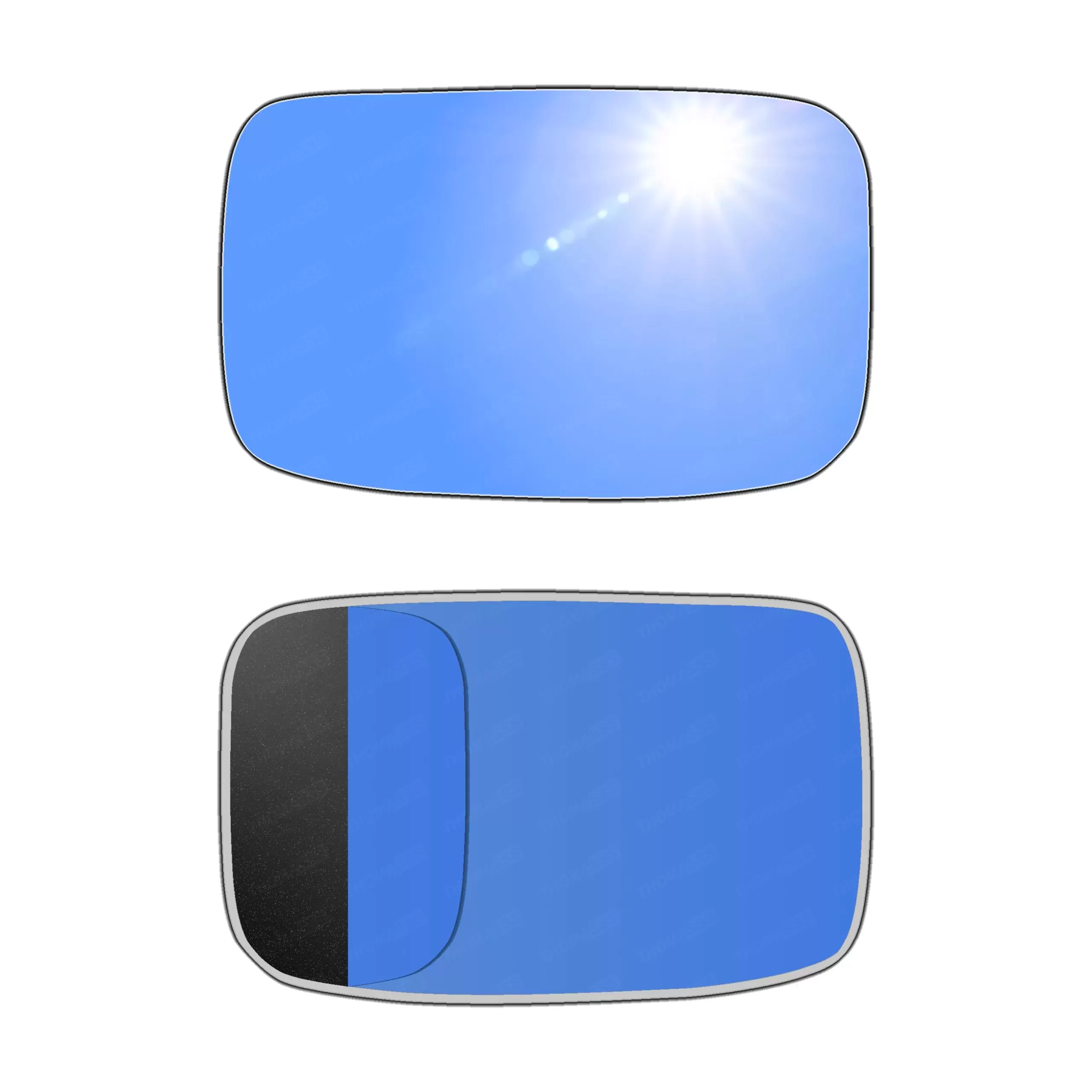 Niebieski (antyrefleksyjny)Powłoka w niebieskim odcieniu pomaga tłumić odbicia światła, zwłaszcza w nocy, co zapobiega oślepianiu kierowcy przez światła samochodów jadących z tyłu. Takie rozwiązanie działa podobnie jak lusterka FOTOCHROMATYCZNE i ELEKTROCHROMATYCZNE, ale w bardziej pasywny sposób i są od takich lusterek znacznie tańsze.W niektórych modelach, szczególnie w samochodach sportowych lub klasy wyższej, niebieska tonacja była stosowana, by nadać pojazdowi nowoczesny i prestiżowy wygląd.