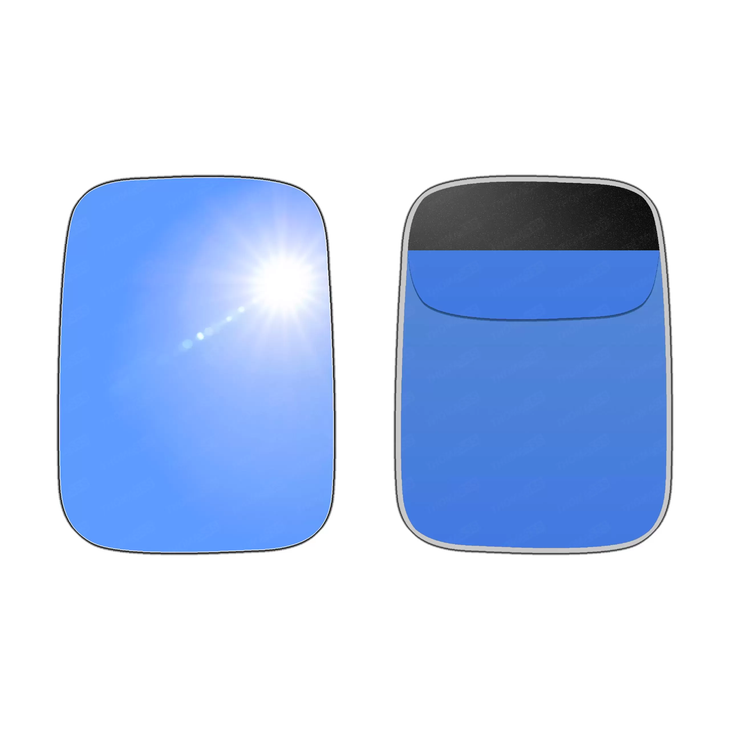 Niebieski (antyrefleksyjny)Powłoka w niebieskim odcieniu pomaga tłumić odbicia światła, zwłaszcza w nocy, co zapobiega oślepianiu kierowcy przez światła samochodów jadących z tyłu. Takie rozwiązanie działa podobnie jak lusterka FOTOCHROMATYCZNE i ELEKTROCHROMATYCZNE, ale w bardziej pasywny sposób i są od takich lusterek znacznie tańsze.W niektórych modelach, szczególnie w samochodach sportowych lub klasy wyższej, niebieska tonacja była stosowana, by nadać pojazdowi nowoczesny i prestiżowy wygląd.