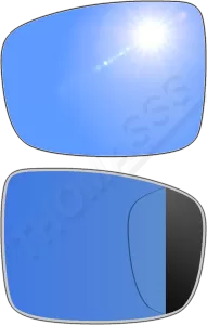 Niebieski (antyrefleksyjny)Powłoka w niebieskim odcieniu pomaga tłumić odbicia światła, zwłaszcza w nocy, co zapobiega oślepianiu kierowcy przez światła samochodów jadących z tyłu. Takie rozwiązanie działa podobnie jak lusterka FOTOCHROMATYCZNE i ELEKTROCHROMATYCZNE, ale w bardziej pasywny sposób i są od takich lusterek znacznie tańsze.W niektórych modelach, szczególnie w samochodach sportowych lub klasy wyższej, niebieska tonacja była stosowana, by nadać pojazdowi nowoczesny i prestiżowy wygląd.