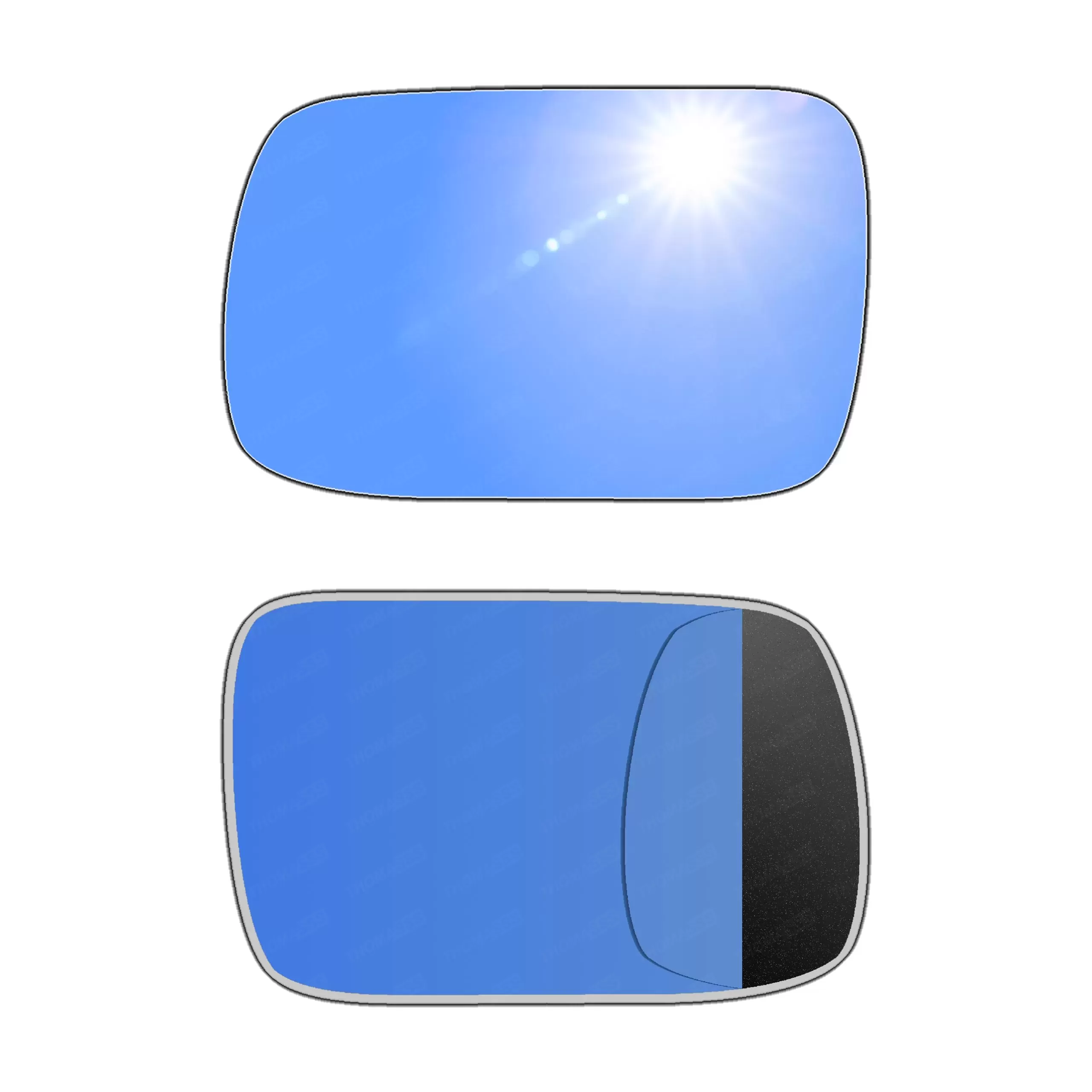Niebieski (antyrefleksyjny)Powłoka w niebieskim odcieniu pomaga tłumić odbicia światła, zwłaszcza w nocy, co zapobiega oślepianiu kierowcy przez światła samochodów jadących z tyłu. Takie rozwiązanie działa podobnie jak lusterka FOTOCHROMATYCZNE i ELEKTROCHROMATYCZNE, ale w bardziej pasywny sposób i są od takich lusterek znacznie tańsze.W niektórych modelach, szczególnie w samochodach sportowych lub klasy wyższej, niebieska tonacja była stosowana, by nadać pojazdowi nowoczesny i prestiżowy wygląd.