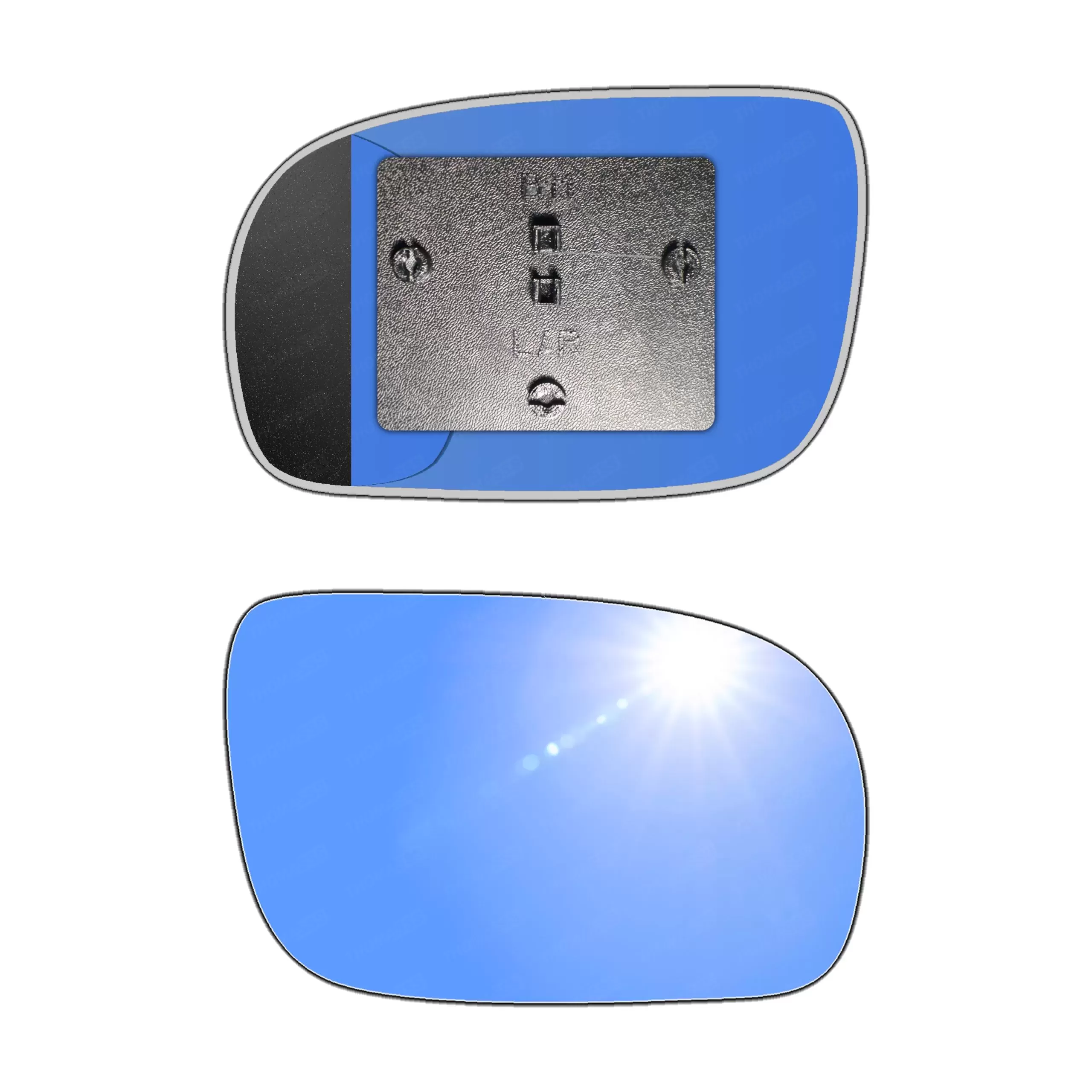 Niebieski (antyrefleksyjny)Powłoka w niebieskim odcieniu pomaga tłumić odbicia światła, zwłaszcza w nocy, co zapobiega oślepianiu kierowcy przez światła samochodów jadących z tyłu. Takie rozwiązanie działa podobnie jak lusterka FOTOCHROMATYCZNE i ELEKTROCHROMATYCZNE, ale w bardziej pasywny sposób i są od takich lusterek znacznie tańsze.W niektórych modelach, szczególnie w samochodach sportowych lub klasy wyższej, niebieska tonacja była stosowana, by nadać pojazdowi nowoczesny i prestiżowy wygląd.