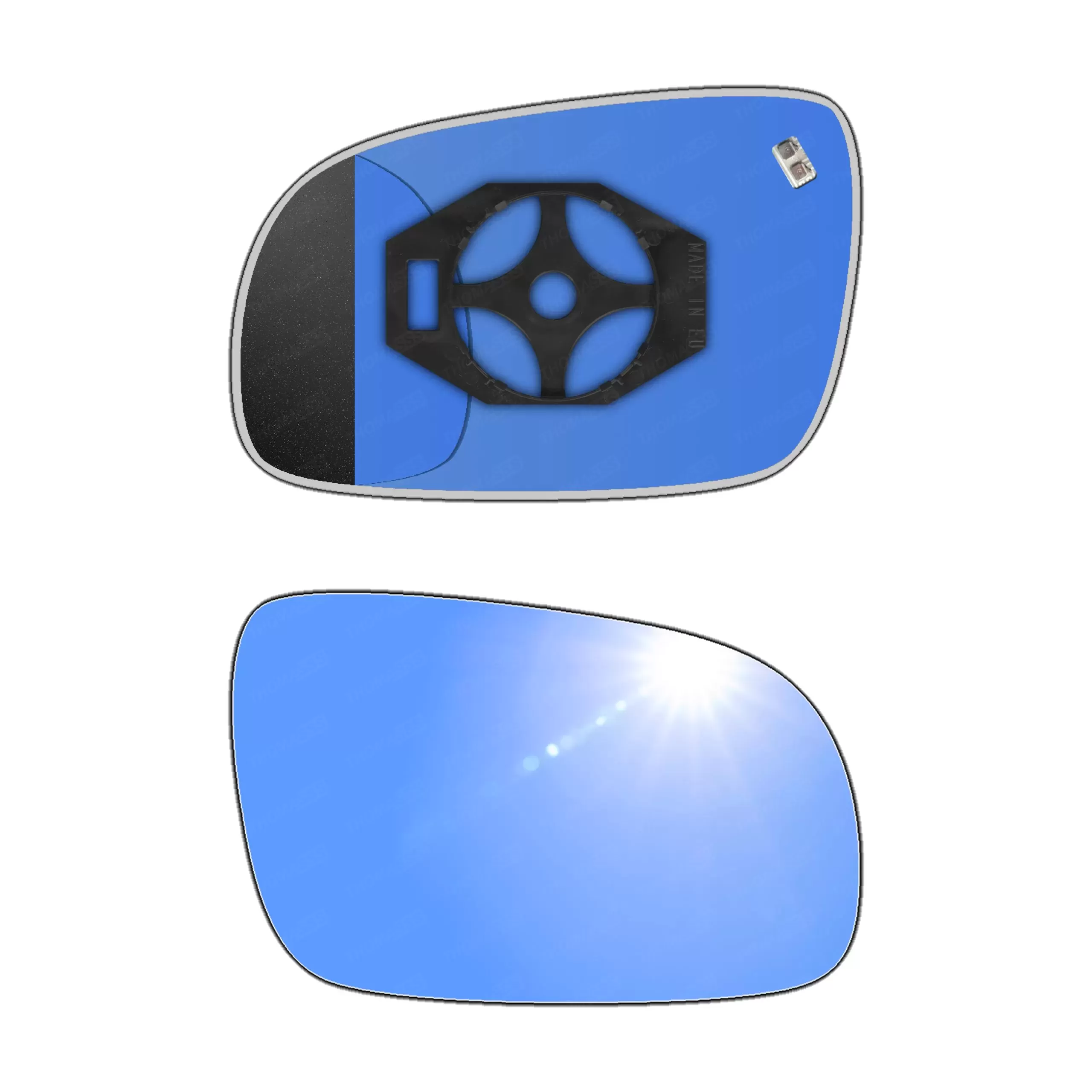 Antyrefleksyjny prawy ogrzewany wkład sferyczny lusterka - z plastikiem montażowym typu E0 i niebieskim oddalającym szkłem z grzałką [#224] do zastosowaniaw Seat Arosa